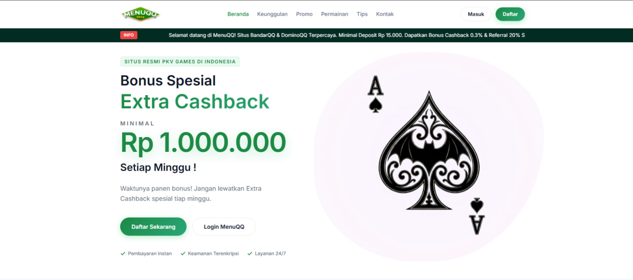 MenuQQ adalah agen resmi PKV Games terpercaya di Indonesia yang menyediakan berbagai permainan kartu online uang asli dengan sistem keamanan tinggi dan server grade-A.